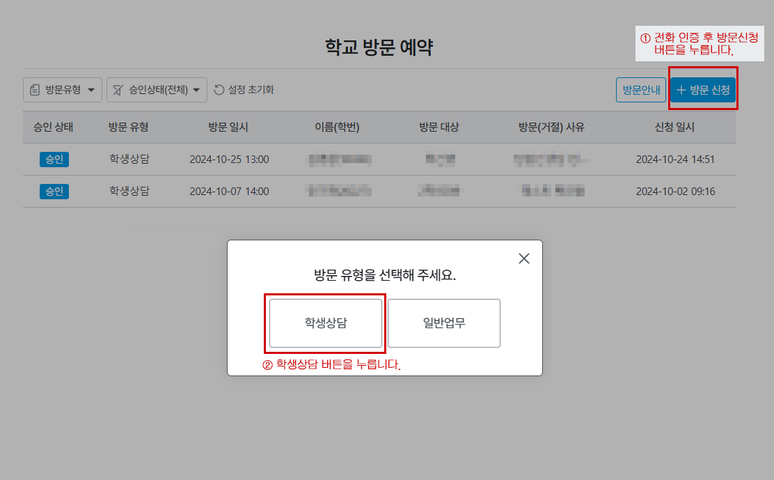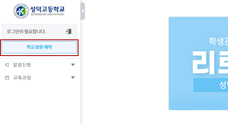 2. ºñȸ¿øÀÎ °æ¿ì ÁÂÃø »ó´ÜÀÇ 'Çб³ ¹æ¹® ¿¹¾à' ¹öưÀ» Ŭ¸¯Çϰí, ÀüÈ­ ÀÎÁõÀ» ¹Þ½À´Ï´Ù.