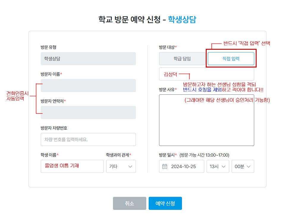 ÀÌ ¶§ ¹Ýµå½Ã ȣĪ ¾øÀÌ '¼±»ý´Ô ¼ºÇÔ'¸¸ ÀÔ·ÂÇÏ¿©¾ß ÇÕ´Ï´Ù. ±×¸®°í ¹æ¹® »çÀ¯¸¦ ±â·ÏÇÑ µÚ '¿¹¾à½Åû' ¹öưÀ» ´©¸¨´Ï´Ù.
