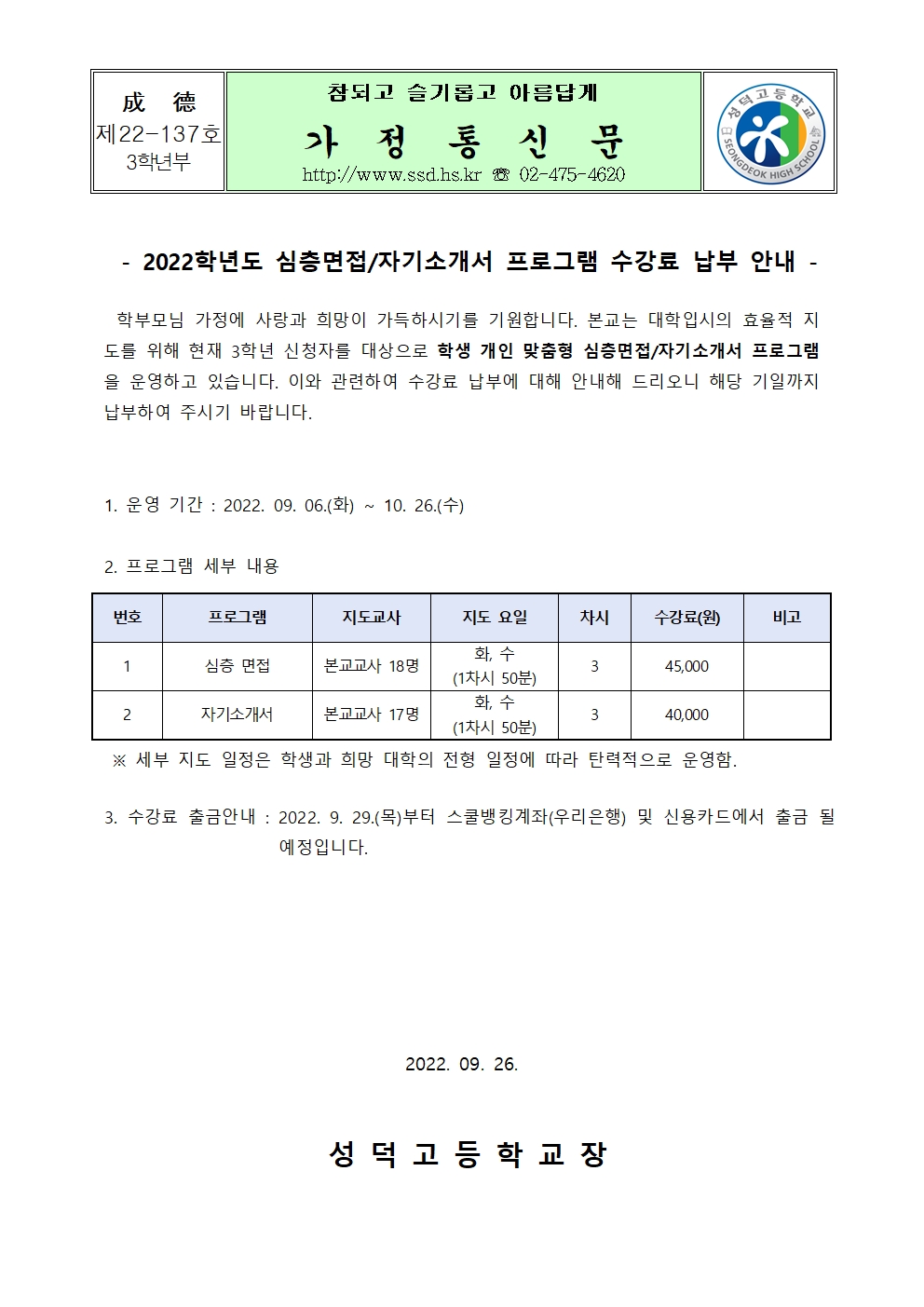 2022Çг⵵ ½ÉÃþ¸éÁ¢ ¹× ÀÚ±â¼Ò°³¼­ ÇÁ·Î±×·¥ ¼ö°­·á ³³ºÎ ¾È³» (3Çгâ)