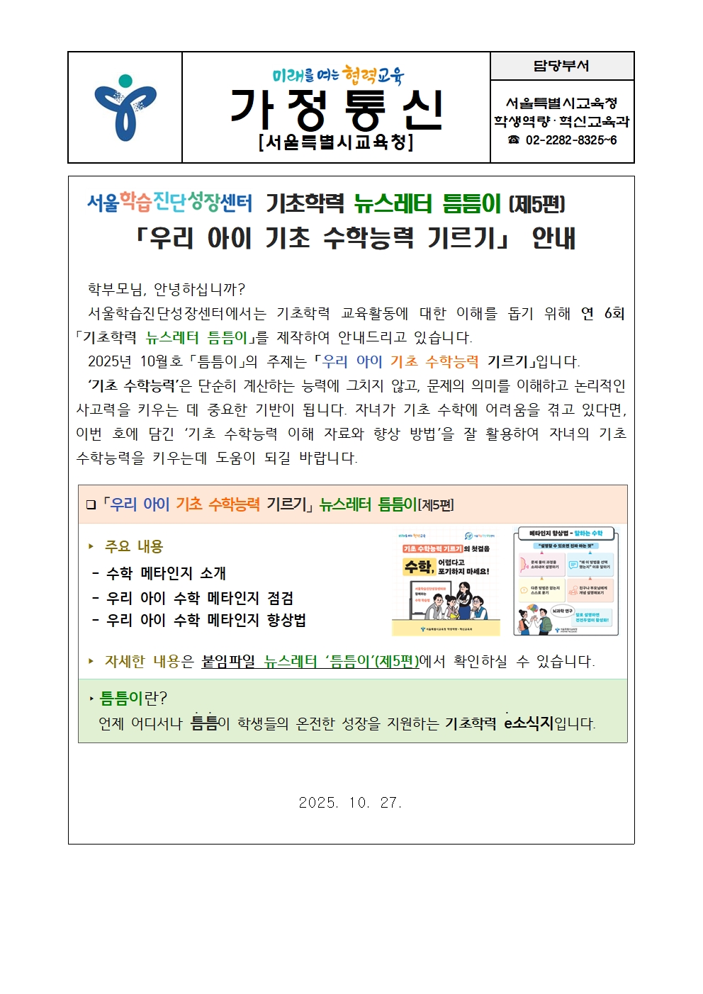 ¼­¿ïÇнÀÁø´Ü¼ºÀå¼¾ÅÍ ±âÃÊÇз ´º½º·¹ÅÍ Æ´Æ´ÀÌ (Á¦5Æí) ¡¸¿ì¸® ¾ÆÀÌ ±âÃÊ ¼öÇдɷ ±â¸£±â¡¹ ¾È³»