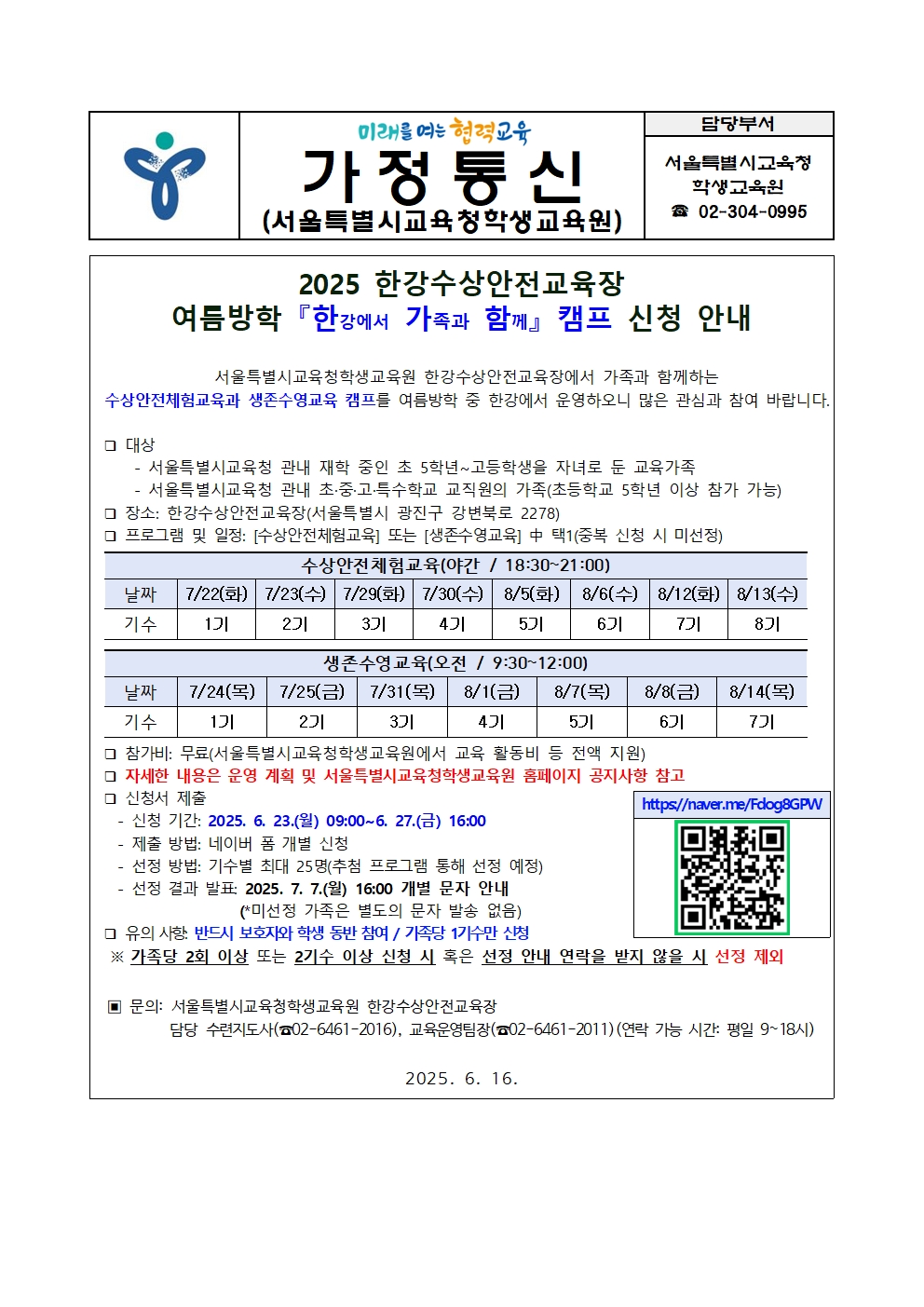 2025 ÇѰ­¼ö»ó¾ÈÀü±³À°Àå ¿©¸§¹æÇÐ ¡ºÇѰ­¿¡¼­ °¡Á·°ú ÇÔ²²¡» Ä·ÇÁ ½Åû ¾È³»