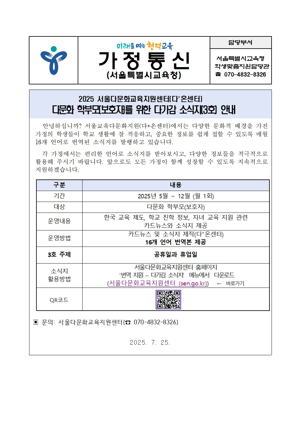2025 ¼­¿ï´Ù¹®È­±³À°Áö¿ø¼¾ÅÍ(´Ù+¿Â¼¾ÅÍ) ´Ù¹®È­ Çкθð(º¸È£ÀÚ)¸¦ À§ÇÑ ´Ù°¡°¨ ¼Ò½ÄÁö(3È£) ¾È³»