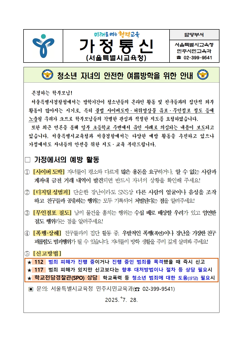 °¡Á¤Åë½Å¹®(û¼Ò³â ÀÚ³àÀÇ ¾ÈÀüÇÑ ¿©¸§¹æÇÐÀ» À§ÇÑ ¾È³»).hwp °¡Á¤Åë½Å¹®(û¼Ò³â ÀÚ³àÀÇ ¾ÈÀüÇÑ ¿©¸§¹æÇÐÀ» À§ÇÑ ¾È³»).hwp   ´Ù¿î·Îµå ¼ö : [ 21 ]