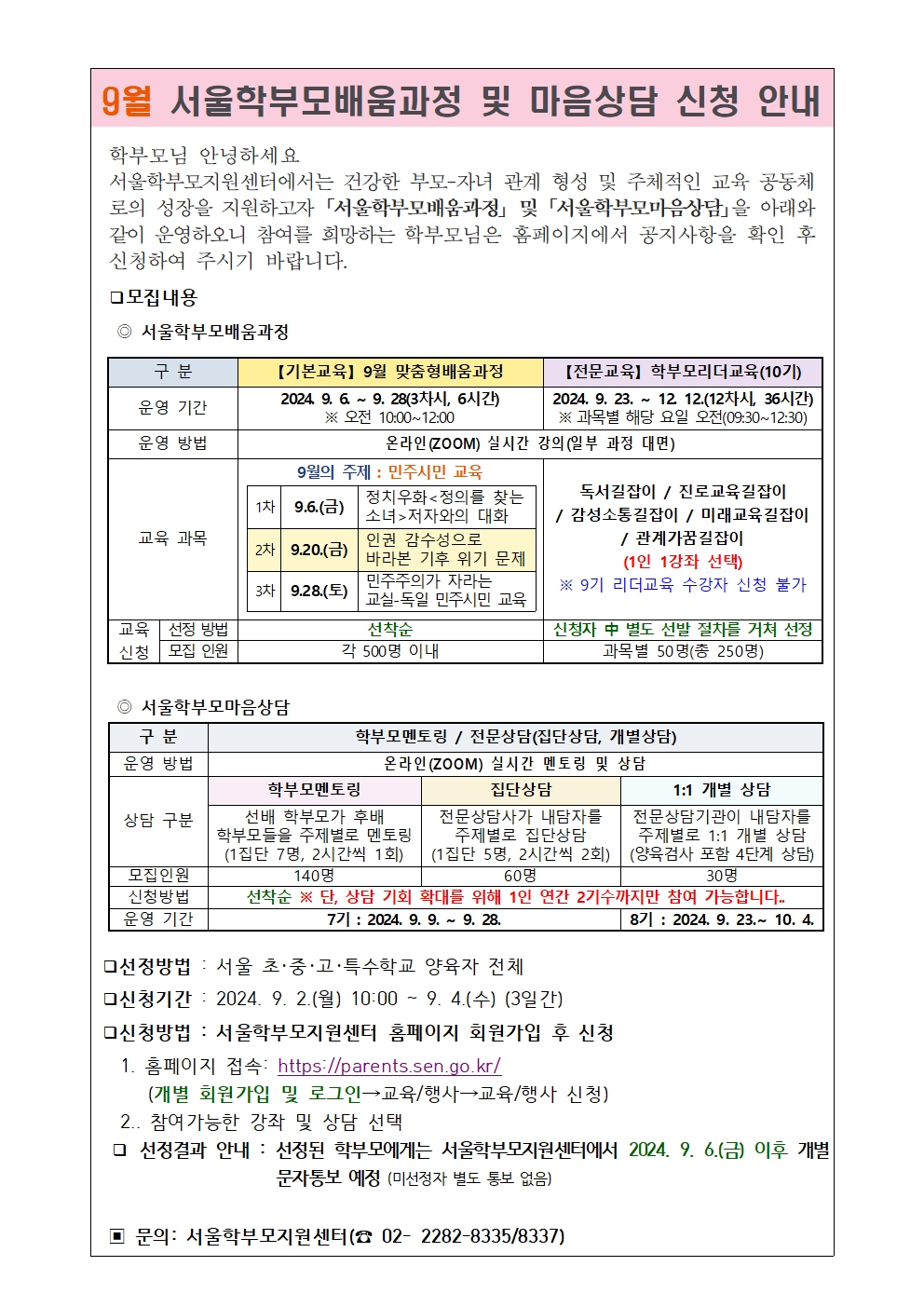 9¿ù ¼­¿ïÇкθð¹è¿ò°úÁ¤ ¹× ¸¶À½»ó´ã ½Åû ¾È³»